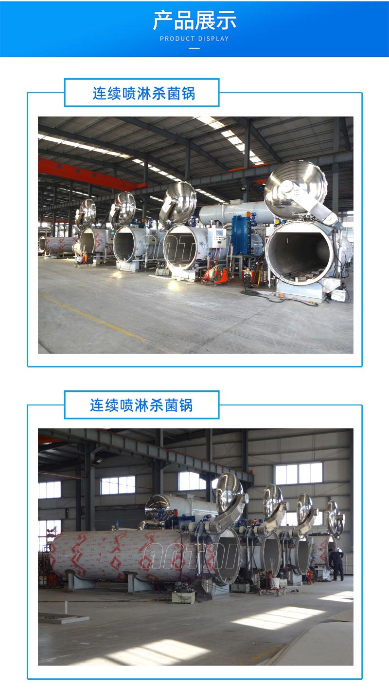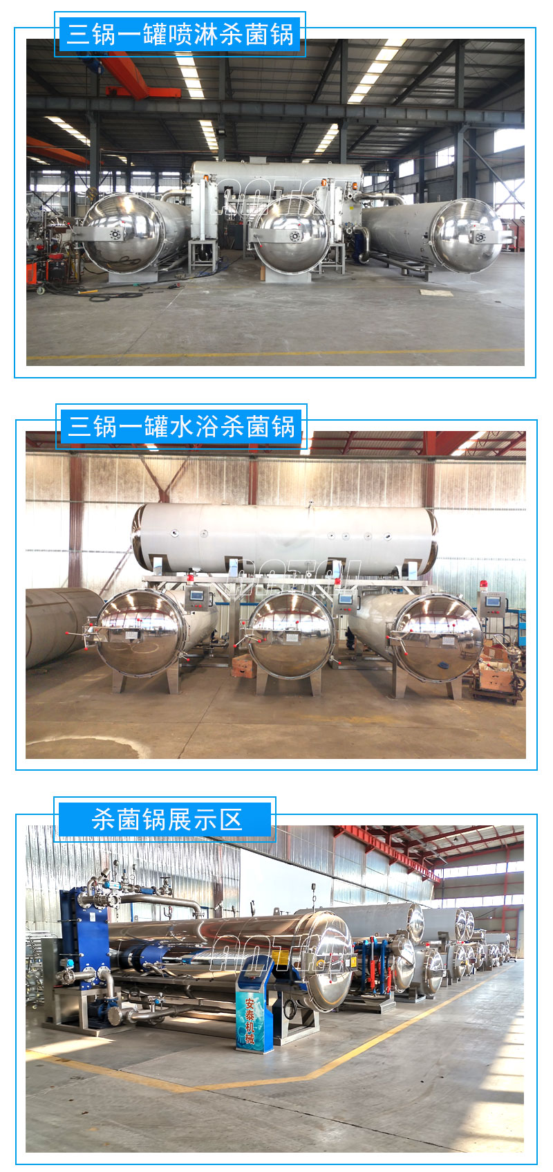 殺菌產品由輸送線進入裝籠機,裝籠機自動將產品有序的碼放進籠筐,籠筐輸送線自動將滿筐產品送入殺菌鍋,殺菌鍋根據(jù)不同的食品加工工藝調控溫度和壓力,熱量分部均勻,壓力控制平穩(wěn),每批次產品殺菌效果一致;滅菌好的產品由籠筐輸送線送到卸籠機,卸籠機自動將產品從籠筐中取出,取出后的產品由輸送線自動送至后包裝設備進行檢測及包裝。